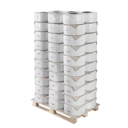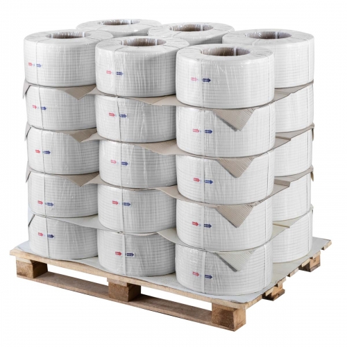 پالت: شامل 60 رول تسمه بسته بندی است. تسمه ها روی یک پالت چوبی به اندازه 80*120 سانتی متر در 10 ردیف 6 تایی قرار می گیرند بین تسمه ها از 9 کفی (ورق های جداکننده ردیف ها) استفاده می شود و دور پالت فیلم استرچ کشیده می شود.